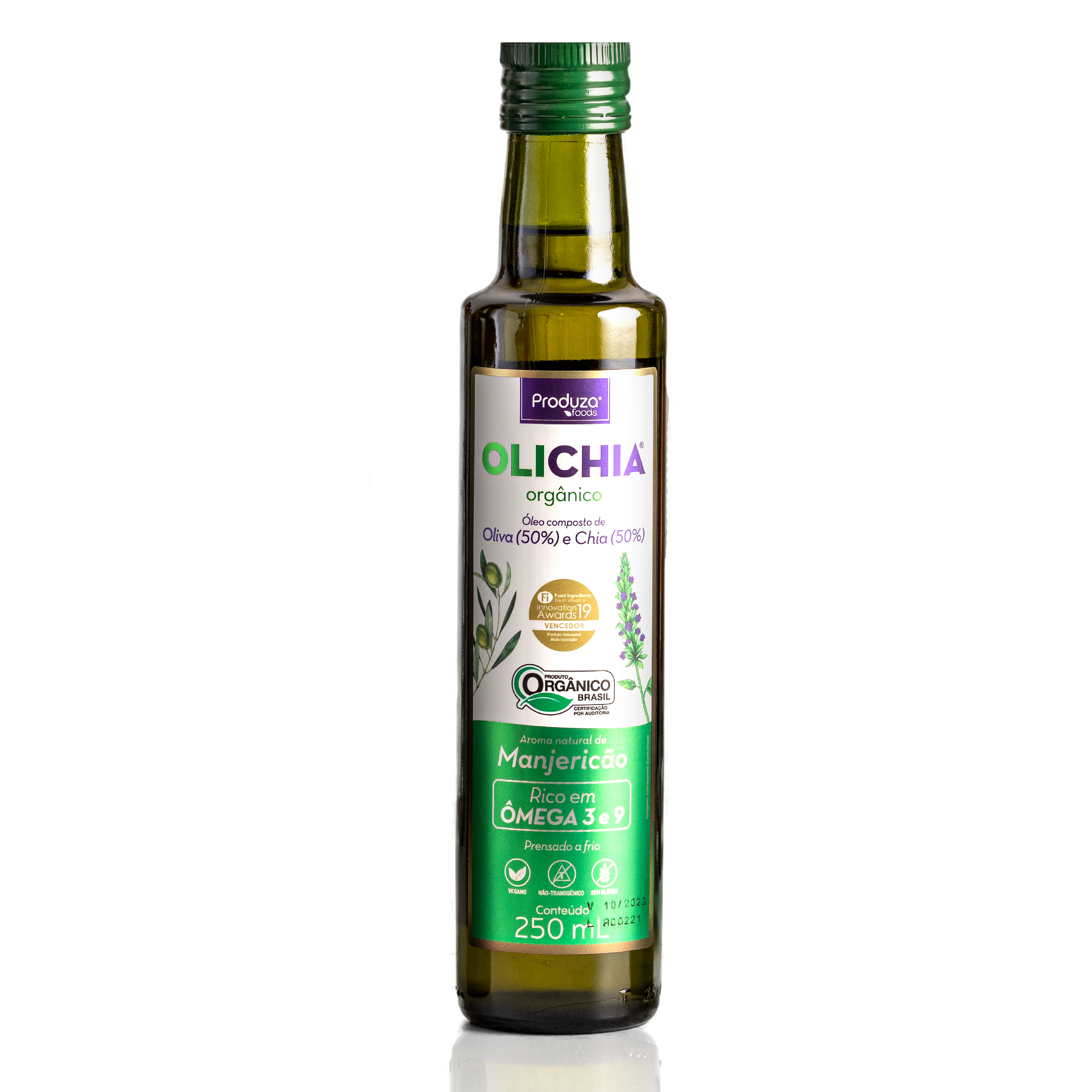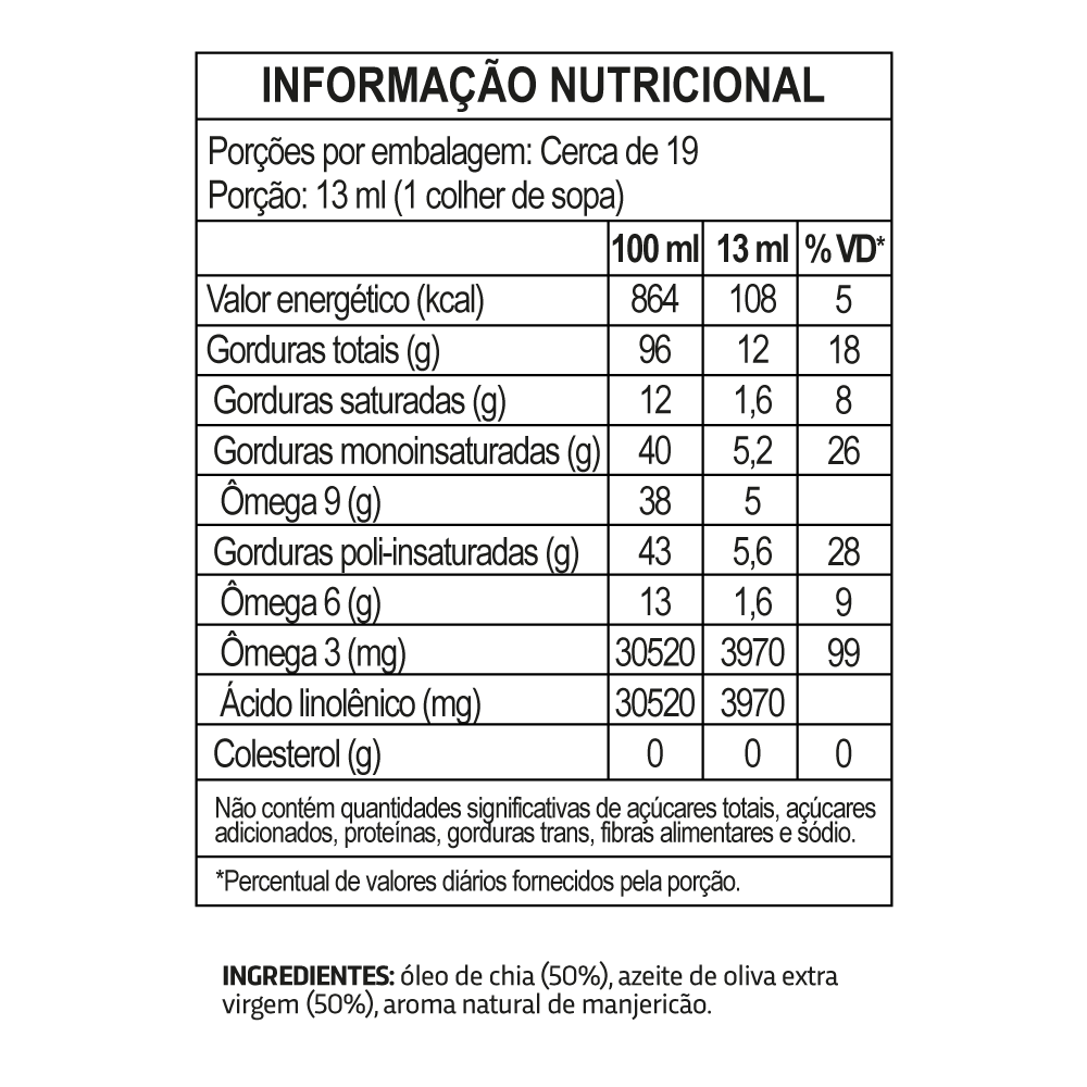 O óleo de Chia Orgânico e Oliva Orgânico com aroma de Manjericão, possui alto conteúdo de ômega 3 e ômega 9 e uma dose diária atende a 99% do valor diário de referência para Ômega 3, auxilia na absorção de vitaminas A, D, E, K, tem ação anti-inflamatória, é fonte de antioxidantes dentre diversos outros benefícios.