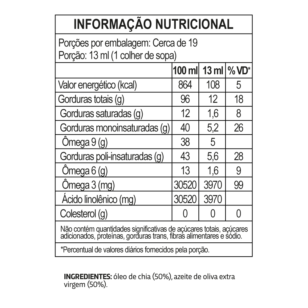 O óleo de Chia Orgânico e Oliva Orgânico possui alto conteúdo de ômega 3 e ômega 9 e uma dose diária atende a 99% do valor diário de referência para Ômega 3, auxilia na absorção de vitaminas A, D, E, K, tem ação anti-inflamatória, é fonte de antioxidantes dentre diversos outros benefícios.