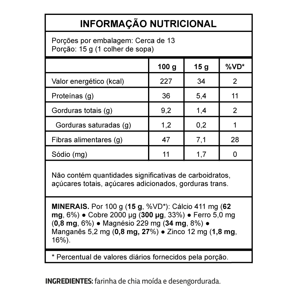 A farinha de chia é uma ótima opção na substituição de farinhas em diversas preparações, não contém glúten é fonte de proteínas e possui alto conteúdo de fibras. Proporciona sensação de saciedade e é uma excelente fonte de nutrientes para uma dieta saudável.